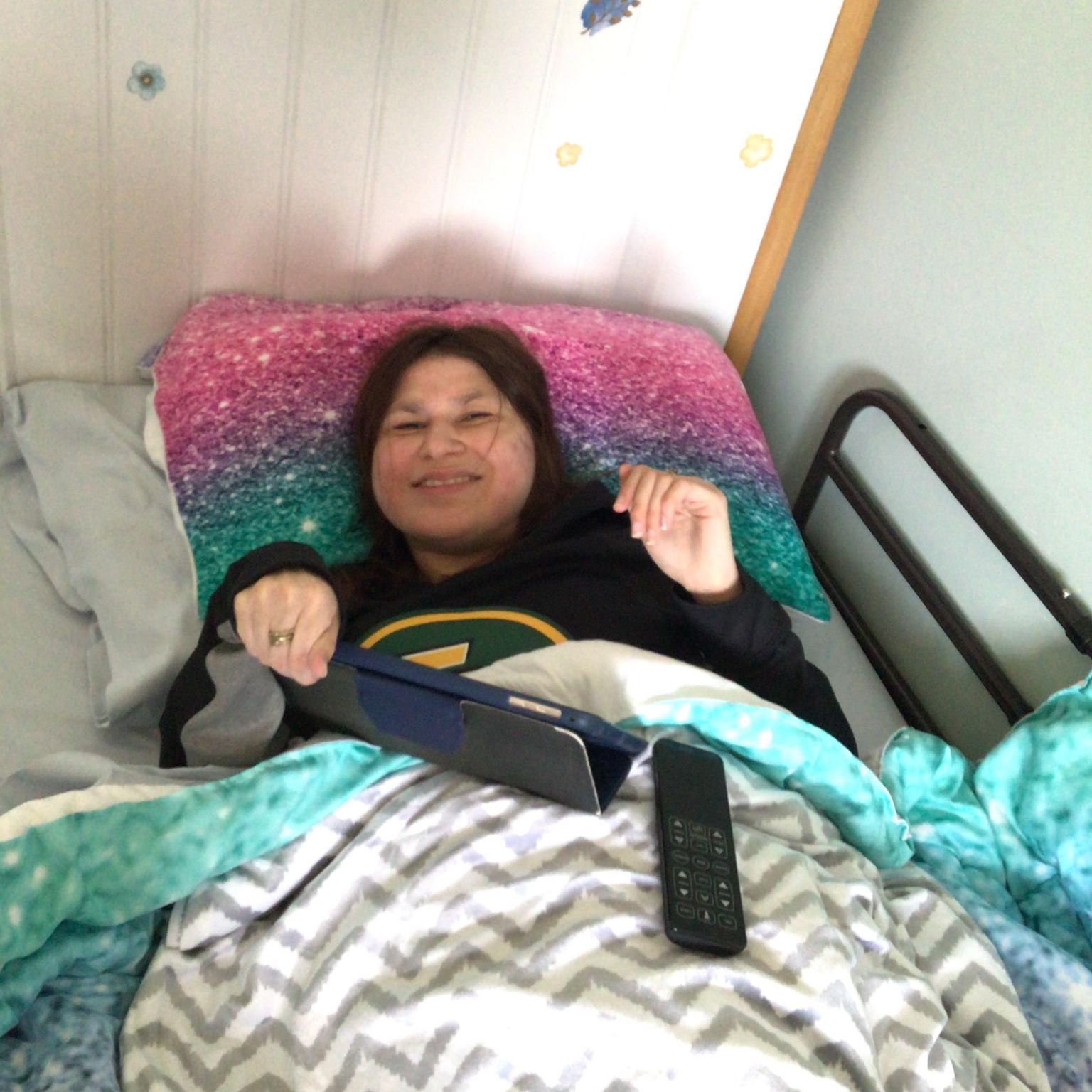 This is a day where I’m in pain and laying in bed with my massage bed on.