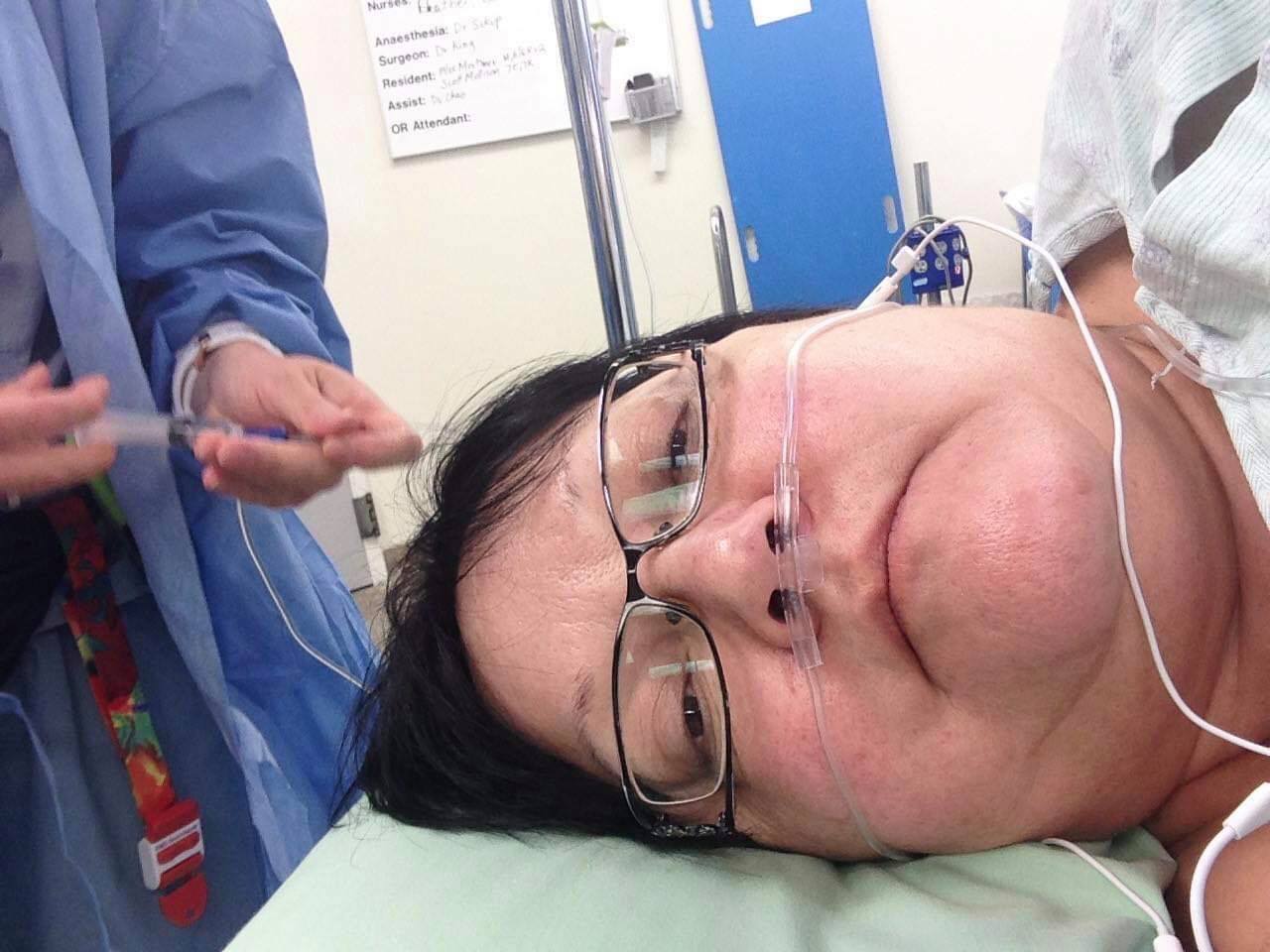 Donna: I told the surgeon and anesthesiologist I wanted to be completely out during my surgery because I didn’t want to hear power tools! I took along my iPhone and my earbuds so I could listen to music. There was a sheet draped across so I couldn’t see below my chest. I thought of holding my phone up and getting a picture, but I didn’t. I did take a selfie, plus one of the surgeon, though. I don’t recall how long the surgery took.