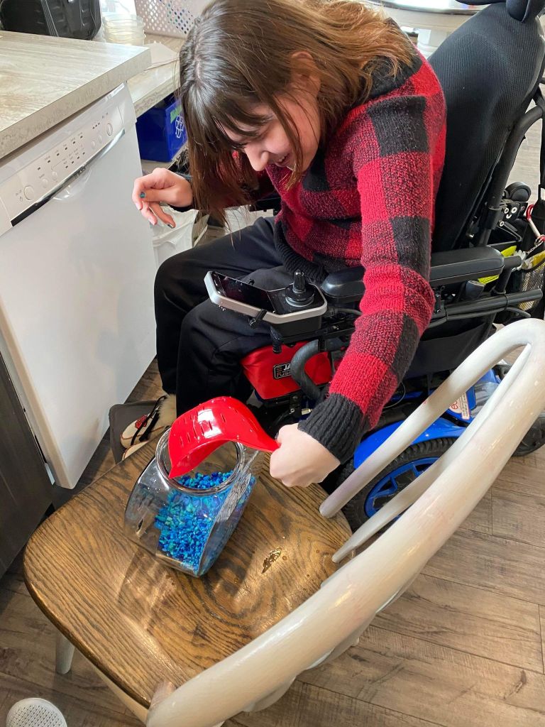 For Theresa’s birthday presents we went to the Beauty and the Beast play on the 1st weekend in February which was awesome. We watched the actual movie before we saw the play while playing Candy Land it was my Christmas present from Craig! I helped my staff clean my fishbowl.