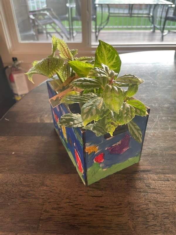 While I had a scavenger hunt with Rose Club my parents were on a food tour in Jasper with Luke, Joel and Ashley! They went to four different restaurants! For our scavenger hunt we had clues and discussion with teammates where we should look! I got a plant holder to paint. Some hair pins and a scarf. Saturday afternoon we painted the plant holder and in the evening we planted three different plants. Mary showed me Junior in the shirt I bought him! It fits him perfectly. He’s definitely growing! I told her to tell Junior to slow down a bit and stay a baby!