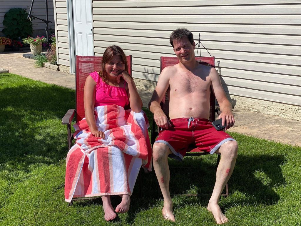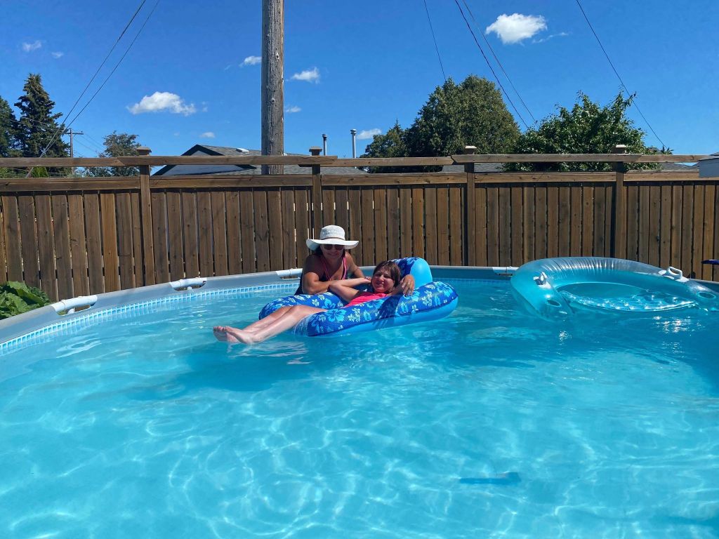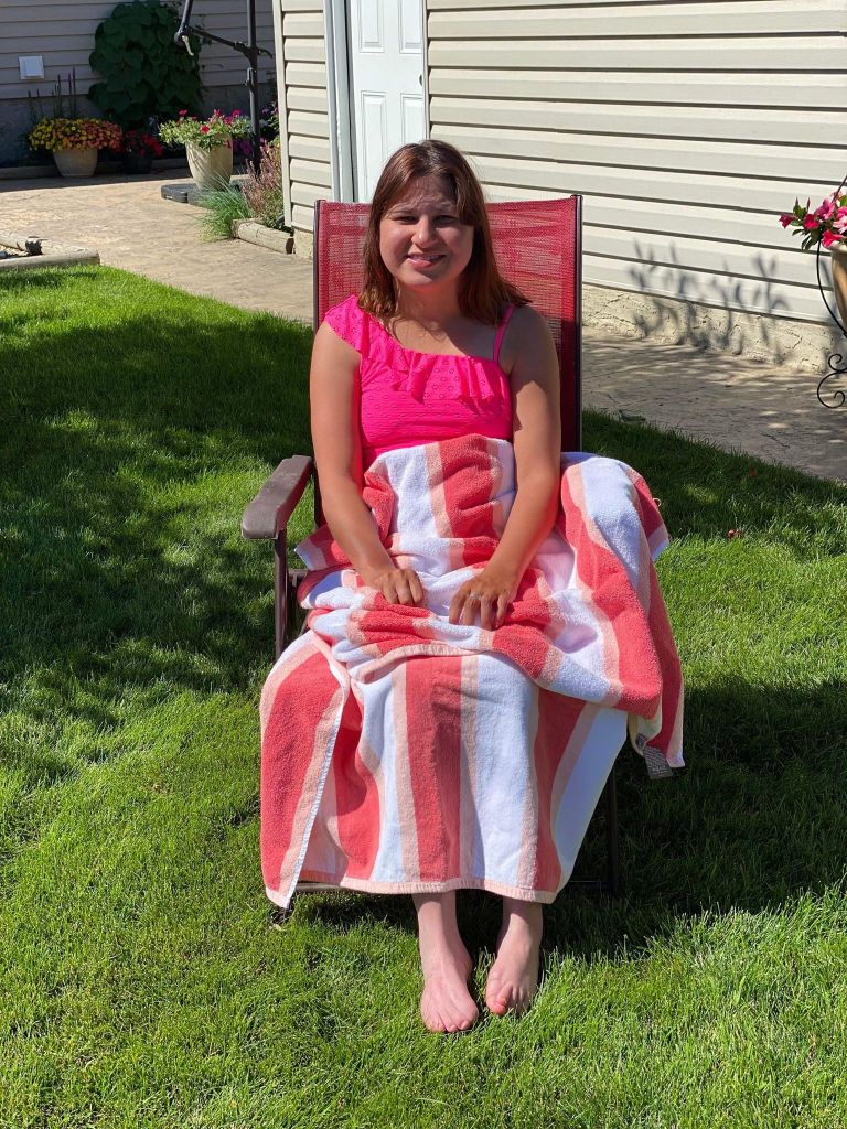 Sunday afternoon we floated in my parent’s pool for the 1st time this summer and then we dried off in the sunshine and I got a sunburn on my legs. It was my 1st time feeling grass that I remember on my feet because I always wear braces, socks and moccasins. It was a neat feeling.