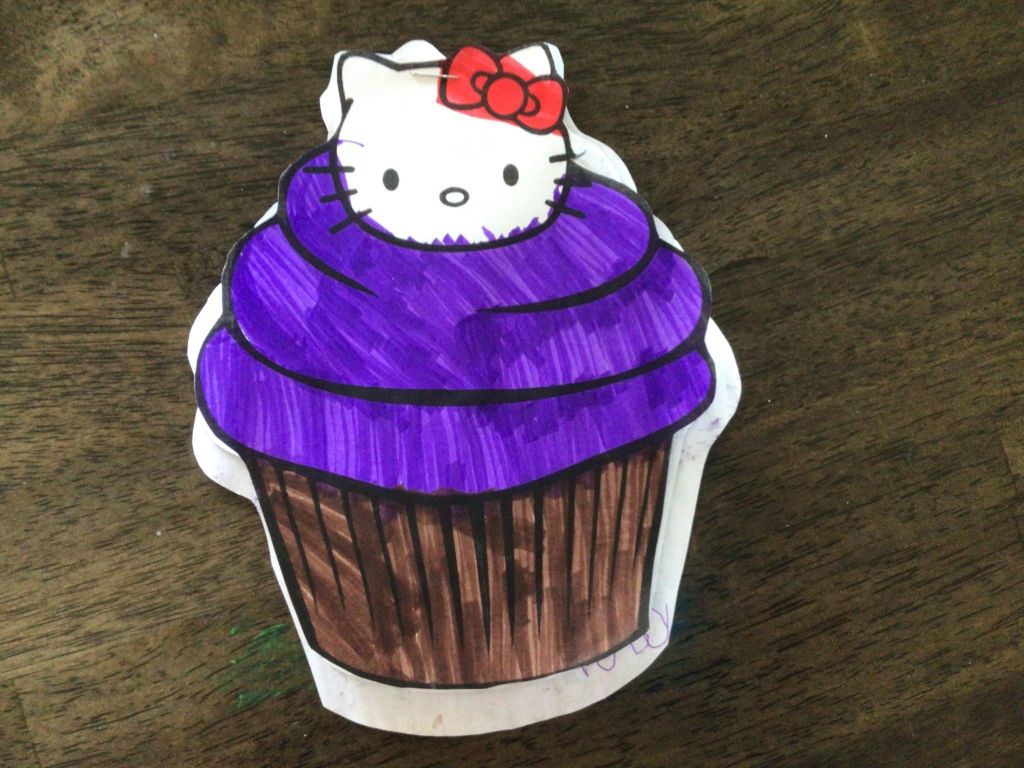 On Friday morning, after I shred paper at the fire hall, I painted a bird and a bird cage. We got some canvases that had pictures from rose Club. I think we might have missed a craft night with Rose Club so, Rebecca dropped them off. I painted the bird’s cage brown. Then I painted the bird dark purple and dark blue. I painted the branches brown and the flowers red. I left it to dry and made a birthday card for my friend. I decided to give my canvas to my friend for her birthday present . I asked her what’s her favourite animal and her favourite colour. She said her favourite colour is purple and her favourite animal is kittens. I found a hello kitty cupcake colouring page on the internet. I made the icing of the cupcake purple and brown paper on the cupcake. I looked up what’s colour is hello kitty on the internet, she’s white with a red bow on the right ear! We cut out the hello kitten cupcakes and stapled them together and made them into an homemade “hello kitty ” cupcake birthday card.