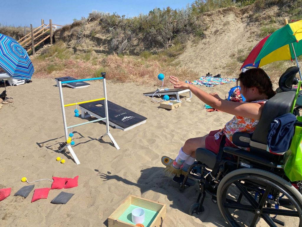 On Saturday morning while Joel and Ashley were golfing, Mom and I went to the Farmer’s Market with our friends David and Janet. While we were there my Uncle Gerald and his girlfriend Terry showed up from a farm by Swift Current. While we were at the farmers market my Dad phoned us and told us he have decided to come to the dance. He drove seven hours and got there just in time for the reception and the dance. After the Farmers market, and lunch we went to the beach and it had lots of stairs that Joel had to carry me and my wheelchair. There was games like bean bag toss and there was ladder ball. The kids had a table boat in the lake.