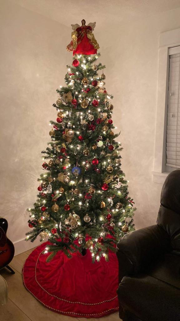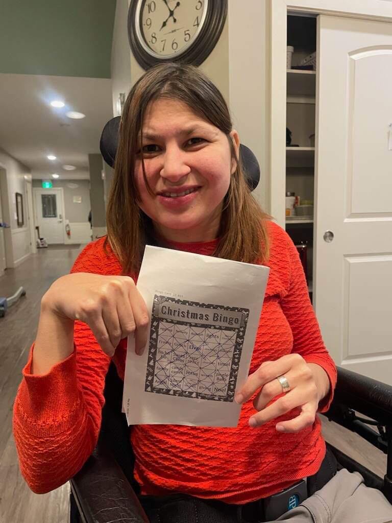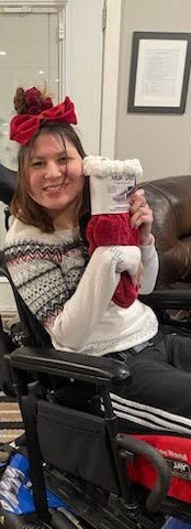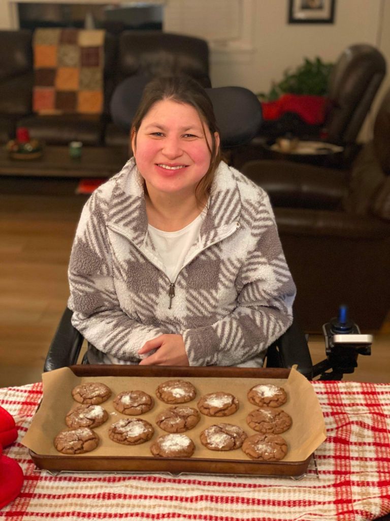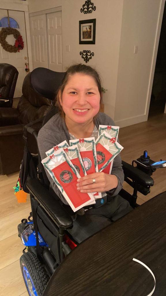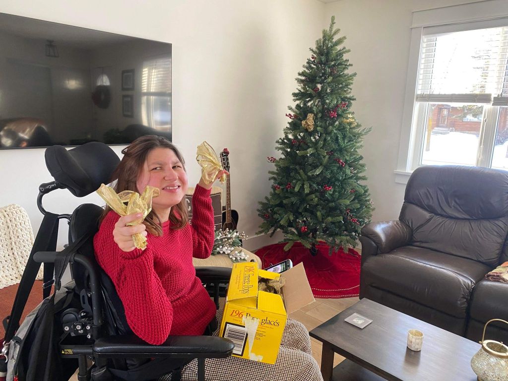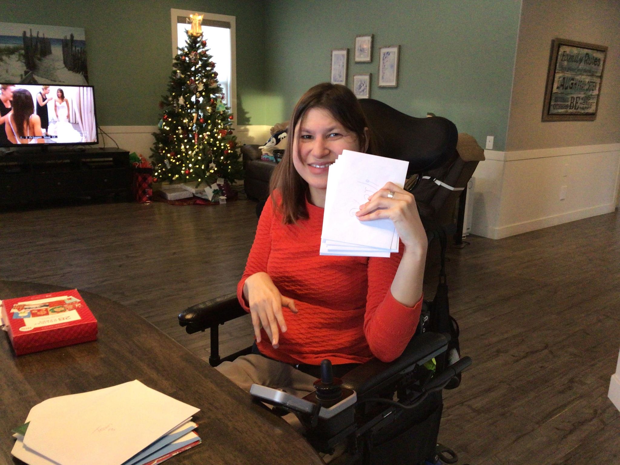 On Sunday afternoon my mom and I wrapped the Christmas presents for my roommates. Most of the Christmas presents were already in boxes so it was easier to wrap and one had an tag on the box so we didn’t have to wrap it. We made Hershey’s Mint Chocolate Chip Nanaimo Bars to freeze so we can have them on Christmas Eve and Christmas Day. The end of November or the bringing of December we change my feeding tube. It seemed to be loose, so we changed it a few weeks earlier than usual. We also change the feeding tube around my birthday too. My mom took a picture of myself in front of the Christmas tree. We also got the Christmas cards addressed and wrote into the inside of Christmas cards. Hopefully the next time that I’m home my mom has ordered the pictures for the Christmas cards, and we can send them out. It was a very busy weekend with Christmas presents shopping, Christmas baking and getting ready for Christmas cards to send out. Slowly but surely, I’m getting ready for Christmas.