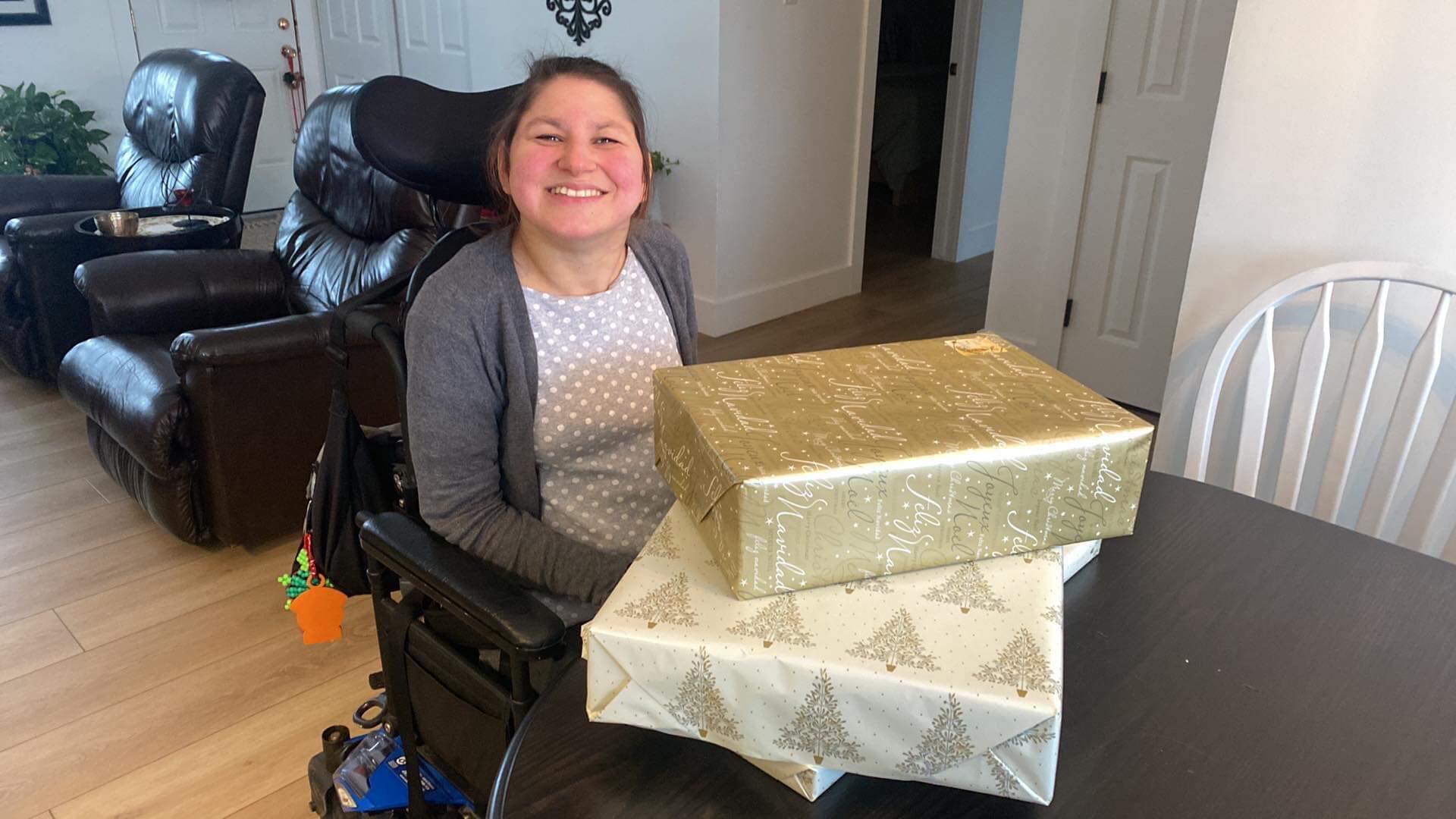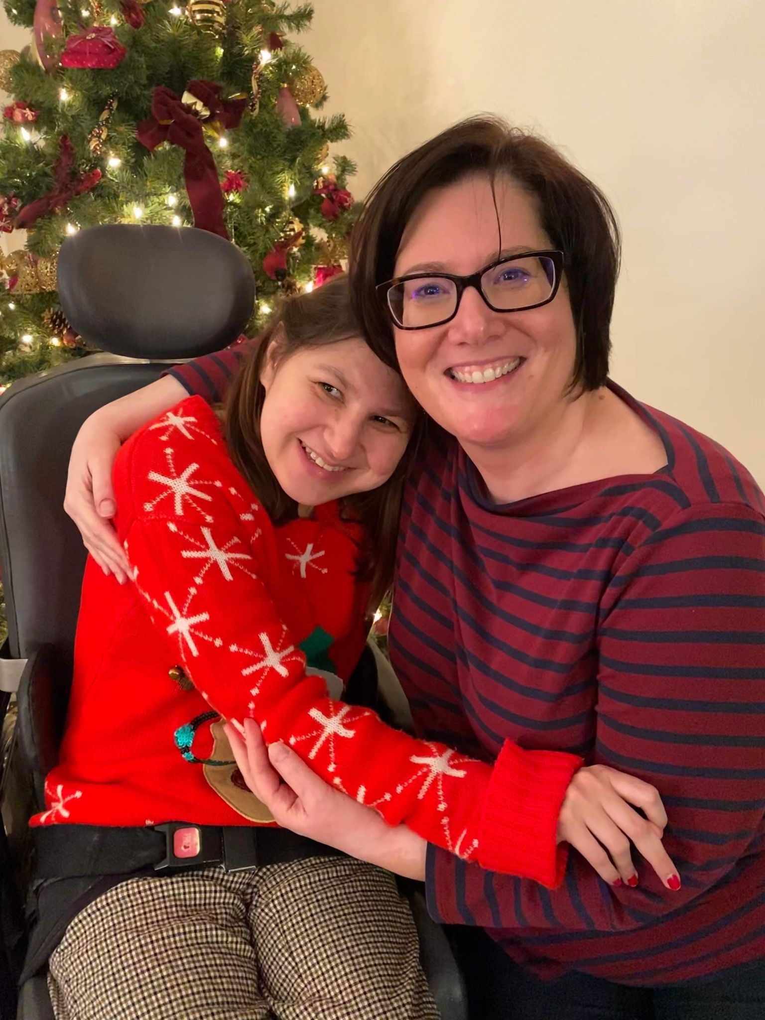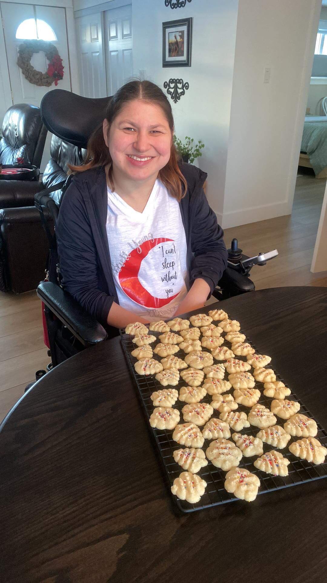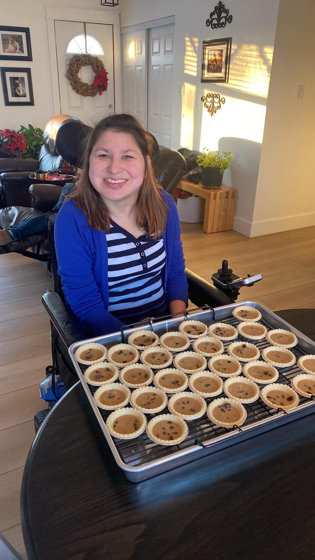 On Sunday afternoon my mom and I wrapped the Christmas presents for my roommates. Most of the Christmas presents were already in boxes so it was easier to wrap and one had an tag on the box so we didn’t have to wrap it. We made Hershey’s Mint Chocolate Chip Nanaimo Bars to freeze so we can have them on Christmas Eve and Christmas Day. The end of November or the bringing of December we change my feeding tube. It seemed to be loose, so we changed it a few weeks earlier than usual. We also change the feeding tube around my birthday too. My mom took a picture of myself in front of the Christmas tree. We also got the Christmas cards addressed and wrote into the inside of Christmas cards. Hopefully the next time that I’m home my mom has ordered the pictures for the Christmas cards, and we can send them out. It was a very busy weekend with Christmas presents shopping, Christmas baking and getting ready for Christmas cards to send out. Slowly but surely, I’m getting ready for Christmas.