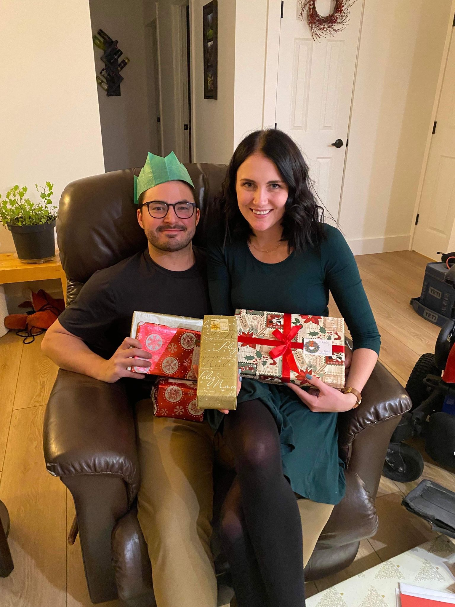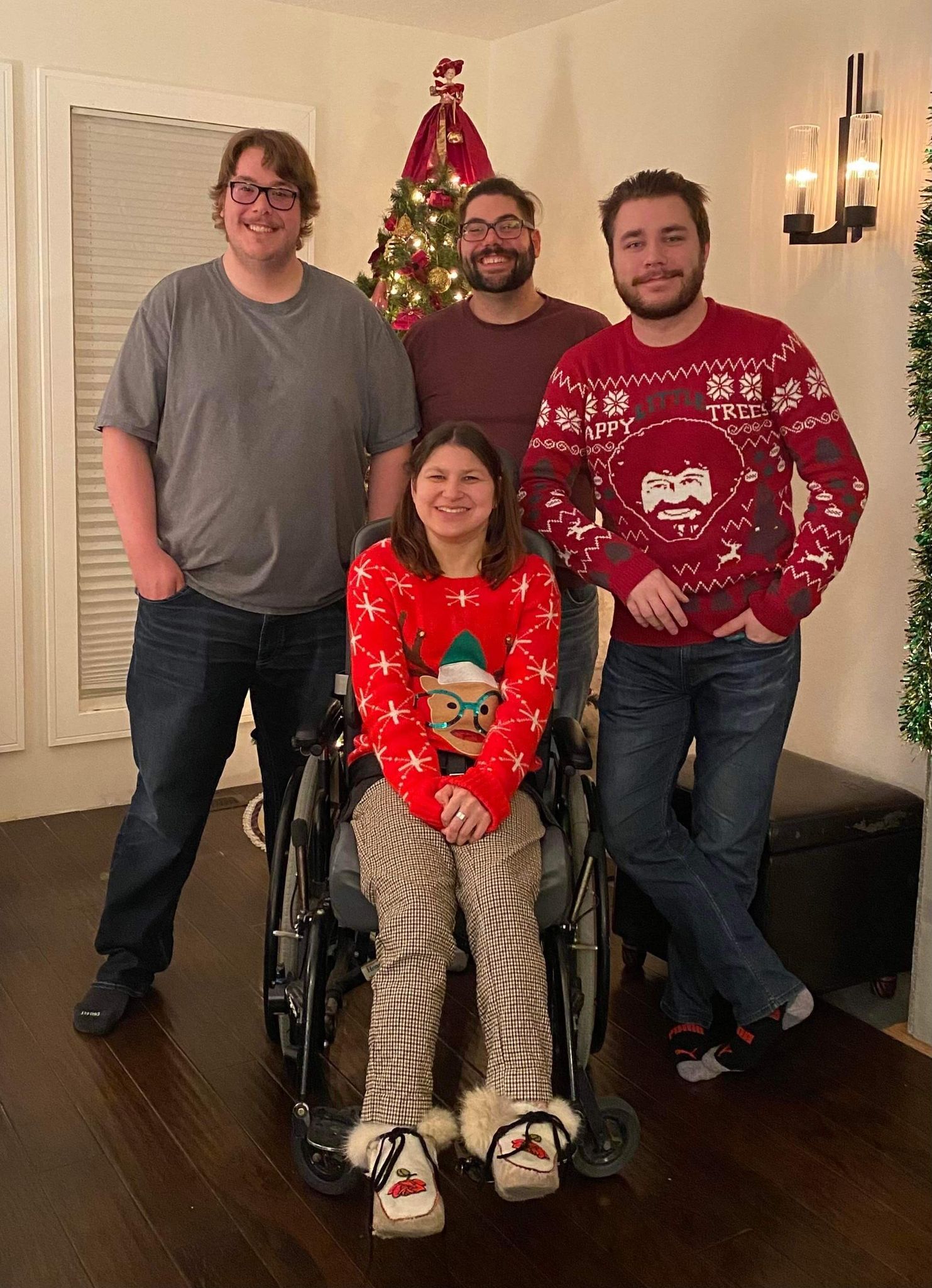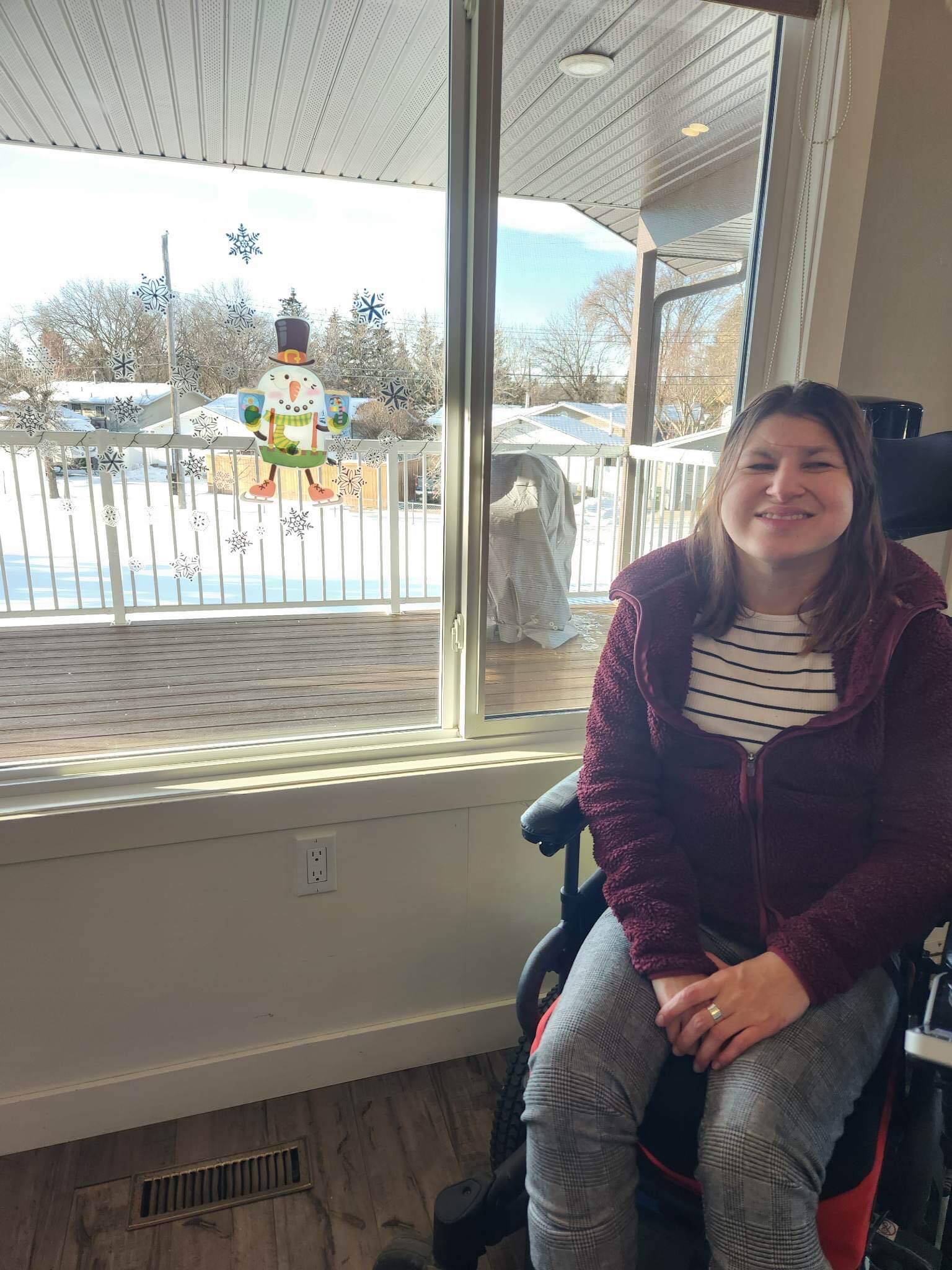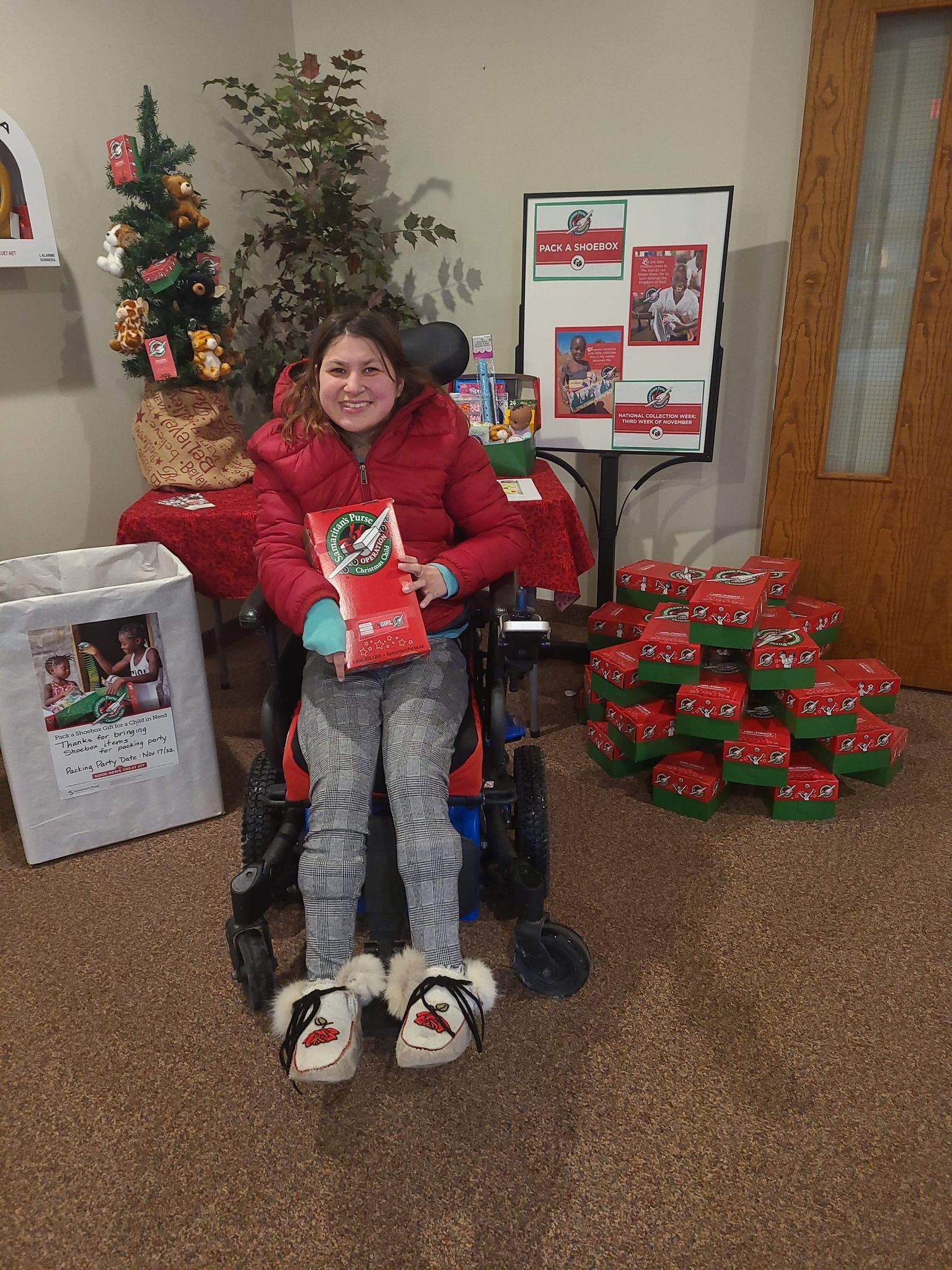 On Sunday afternoon my mom and I wrapped the Christmas presents for my roommates. Most of the Christmas presents were already in boxes so it was easier to wrap and one had an tag on the box so we didn’t have to wrap it. We made Hershey’s Mint Chocolate Chip Nanaimo Bars to freeze so we can have them on Christmas Eve and Christmas Day. The end of November or the bringing of December we change my feeding tube. It seemed to be loose, so we changed it a few weeks earlier than usual. We also change the feeding tube around my birthday too. My mom took a picture of myself in front of the Christmas tree. We also got the Christmas cards addressed and wrote into the inside of Christmas cards. Hopefully the next time that I’m home my mom has ordered the pictures for the Christmas cards, and we can send them out. It was a very busy weekend with Christmas presents shopping, Christmas baking and getting ready for Christmas cards to send out. Slowly but surely, I’m getting ready for Christmas.