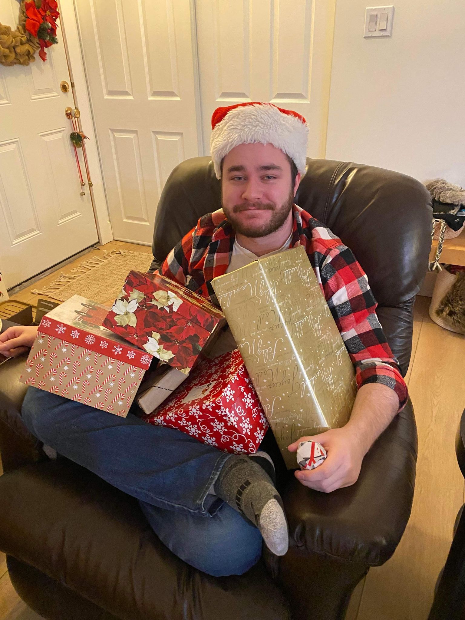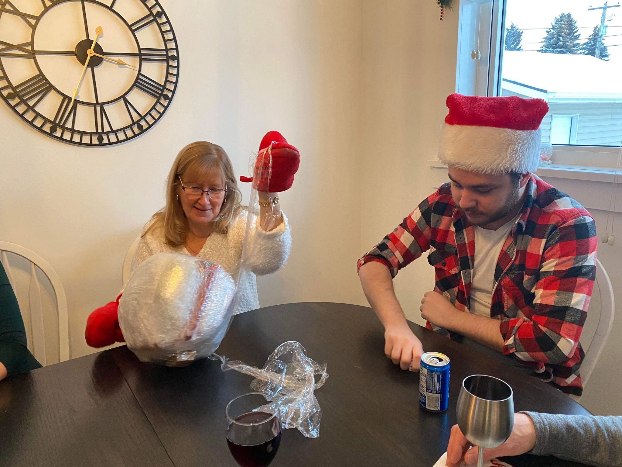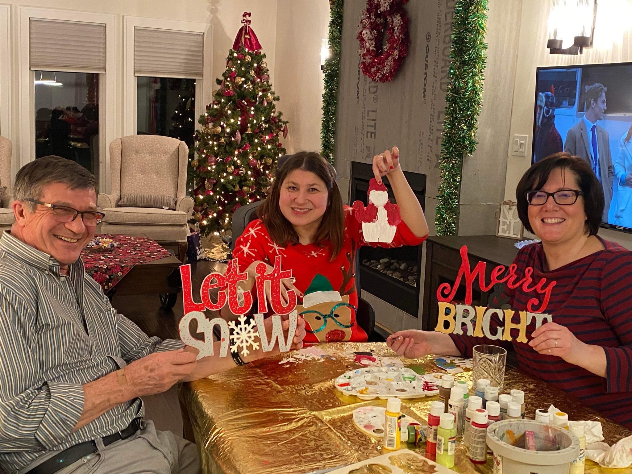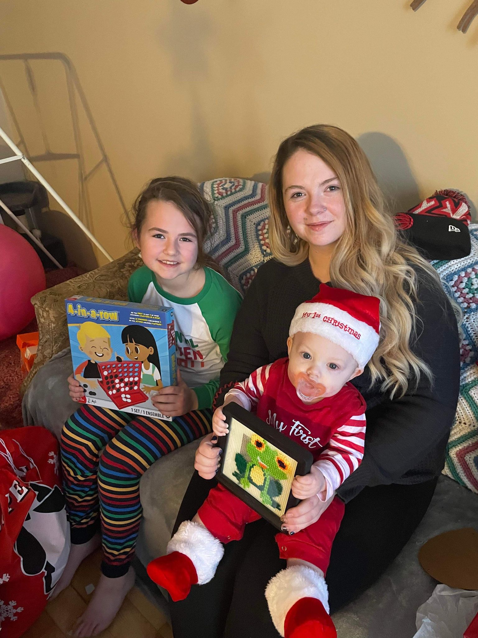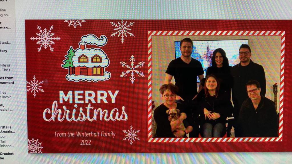On Christmas Day Mary sent me pictures of her kids with the Christmas presents that I sent them! They loved them! I got junior a 1st Christmas outfit (a Santa hat and socks) and an frog cross stitch that I made. I got Alayna the game four in a row which she loved! Then, Joel and I played Shut the box, one of the games I got for Christmas! For Christmas morning breakfast we had Christmas shaped pancakes which Joel and Ashley cooked, bacon and yogurt with homemade Saskatoon syrup. It was delicious. In the afternoon on Christmas Joel, Ashley and Coco went to Moose Jaw to Ashley’s family’s Christmas. My dad and I tried to get the Christmas cards and pictures sent to people in town, but we got our company! My Auntie Gail, Uncle Wayne and my two Cousins Eric and Ian arrived a half hour earlier than expected! I got Christmas presents of: Hot Chocolate bombs that we took to grandpa’s house. Cross stitch butterfly, Christmas leggings and Maddie and Tae’s Christmas CD. I gave my auntie Gail a blue and green sweater. After visiting for awhile, exchanging Christmas presents and having goodies, We went to our grandpa’s house for Christmas dinner and we painted wooden Christmas ornaments with everyone! We took family pictures and cousin pictures in front of the Christmas tree. Merry Christmas everyone. I hope everyone had an amazing Christmas season! It was wonderful winter wonderful land’s Christmas 2022!
