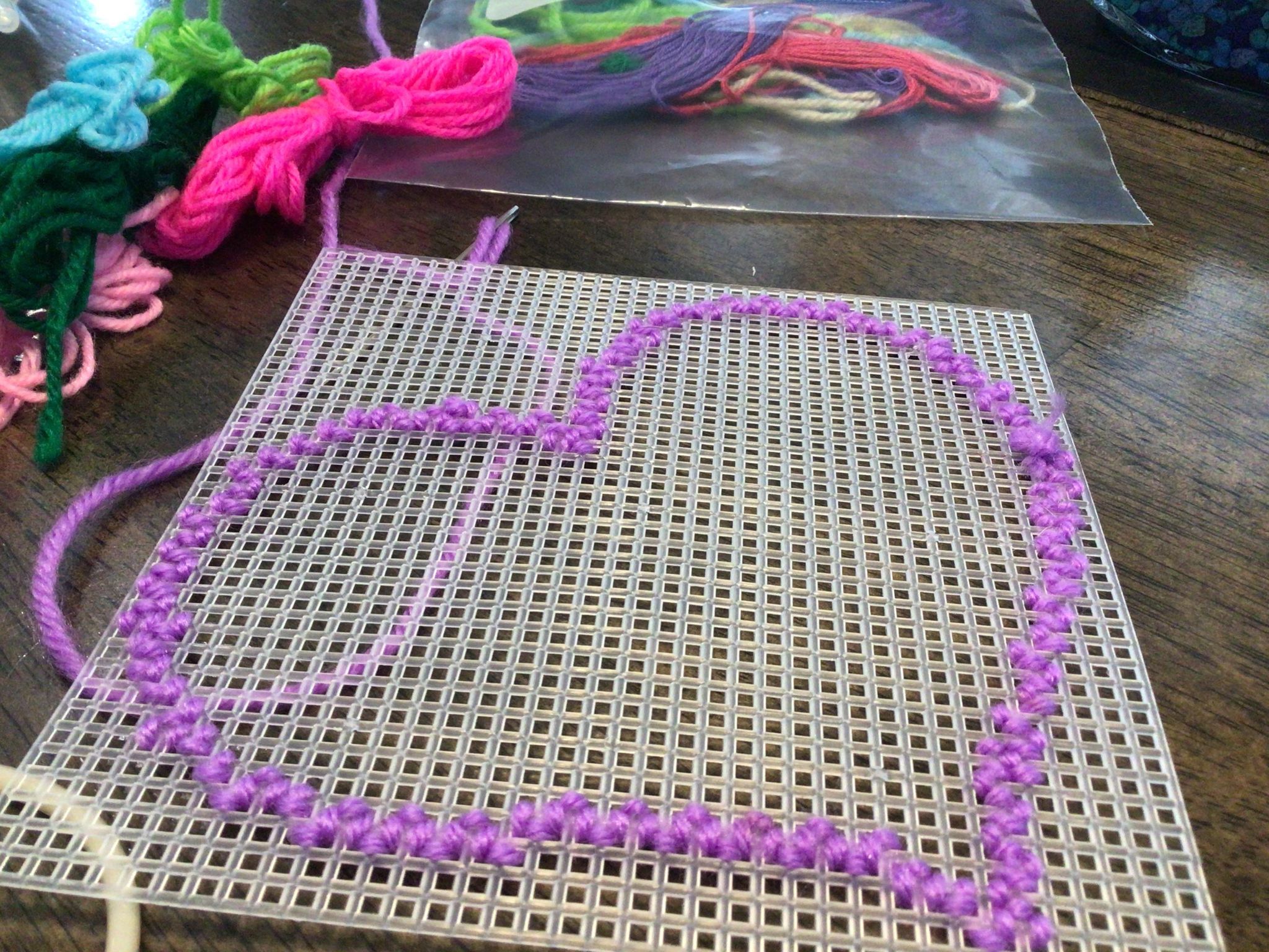 On Wednesday morning at Centra cam I played time Dominoes, and I finished writing up my interview with the fire man and played Camrose Monopoly. On Wednesday afternoon I finished my picture that says Salt in the air and sand in my hair with yellow, purple, and red writing. I made the background that looks like a sunset, which is light purple, dark purple and pink. I put in some blue waves, a pink seashell and a red fish! My mom showed me that she made poppycock! Later on, before dinner time Taryn and I got some food bank items for the food bank for CAFCL. So we made a quick Walmart run and we got two boxes of pasta, three different pasta sauces and four different kinds of Kraft Mac and cheese bowls. During having dinner, we did some purple petals on the cross stitch.