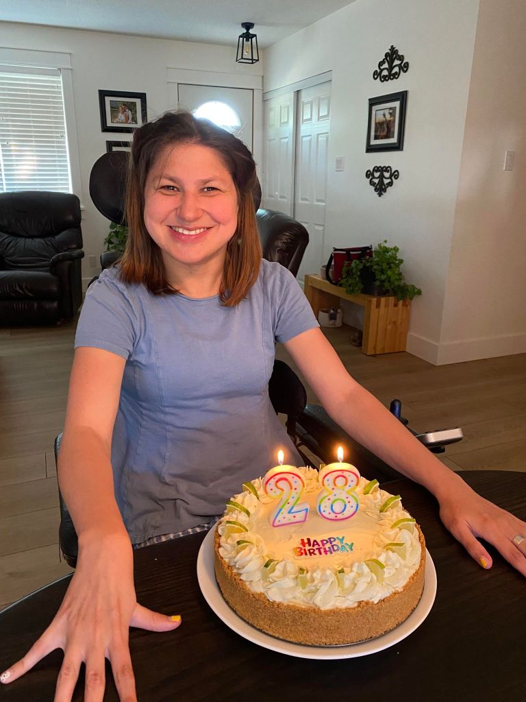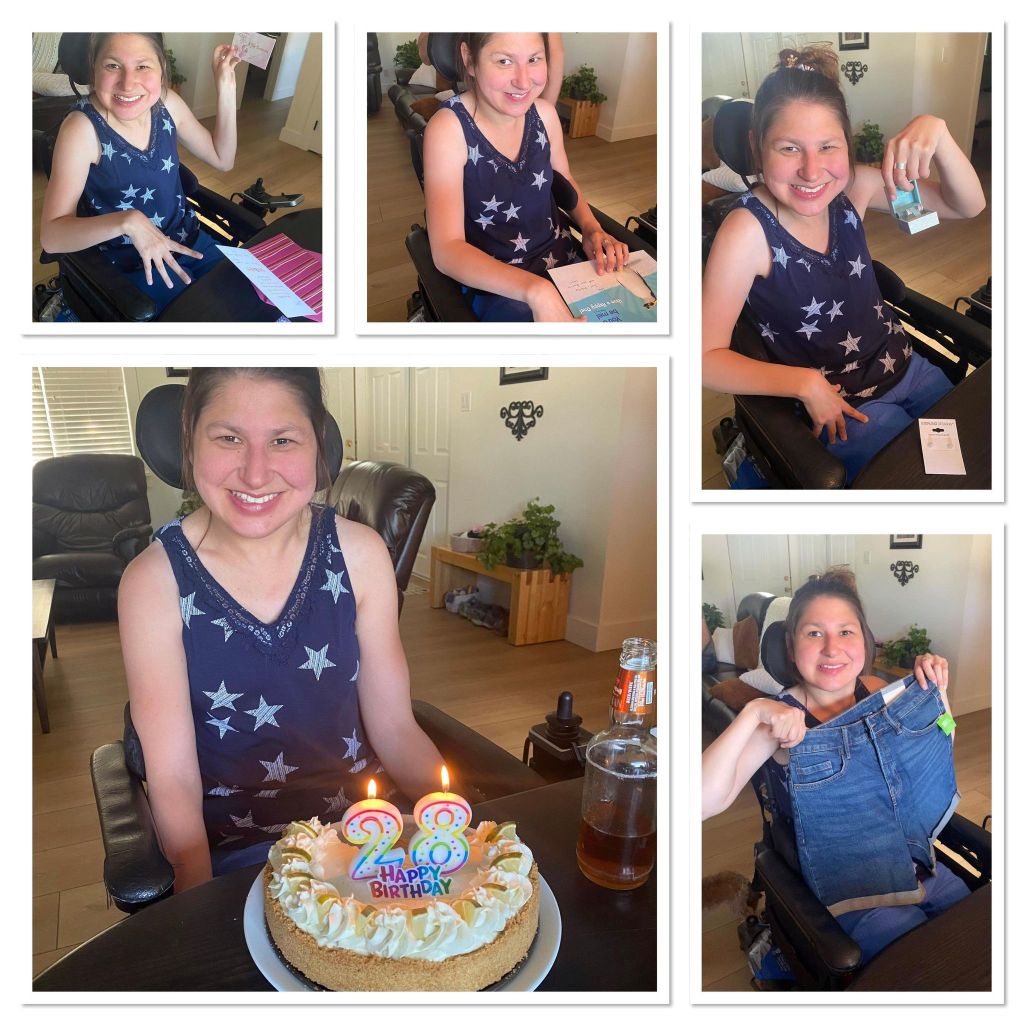 Then on the Sunday my family celebrated my birthday. We played outside games and had pizza, with homemade lime cheesecake that was amazing, probably the best cheesecake ever! I did not open my birthday presents until my birthday! On my birthday my brother Joel smoked our beef for dinner with some potatoes and salad. Our grandpa came for birthday cake. We decided to finish our lime cheesecake for dessert! For birthday presents I got some butterfly PJS and some shower gel and lotion that has butterflies on the bottle. Joel and Ashley gave me the Shaina Twain CD. My mom gave me a wallet but she’s going to get me a different one. Grandpa and Shandy got a nail gift certificate for studio nails. My friend Kelsey and her boyfriend Joshua with their girls came over on my birthday and I got some jewelry kits that organize stuff for your jewelery. It was a pretty good birthday and I got really spoiled with presents. On Saturday afternoon we went bowling with my friends and my roommates to celebrate my birthday! Then we went to the house for cheesecake and homemade punch. My friend Laura and Catherine from Centra Cam crashed my birthday party. They gave me happy birthday balloons, a birthday necklace and a birthday card. For my birthday presents, I got a Mauiny sand art kit, word search books, bath bombs, solar light that is a butterfly. Some decorating sand in an jar… it was a pretty good day!
