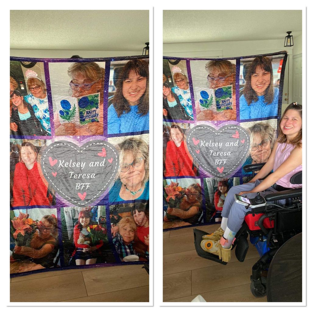 On Friday afternoon my mom and I went to Wetaskiwin to see my best friend forever Teresa and her mom Victoria. We went out for coffee at Tim’s Horton . It was really good to see them in person after long three years of not getting together. I got her a Christmas mug says “happy pawlidays”, hot chocolate and coffee with an picture of cross stitch with flowers in a heart, and I gave her mom Victoria the same one… crossing my fingers they’re won’t fight over their Christmas presents. My best friend forever Teresa spoiled me with colouring books, word search books, markers, the Anna of Green Gables books, paint, and paint brushes. She also got a really beautiful blanket!