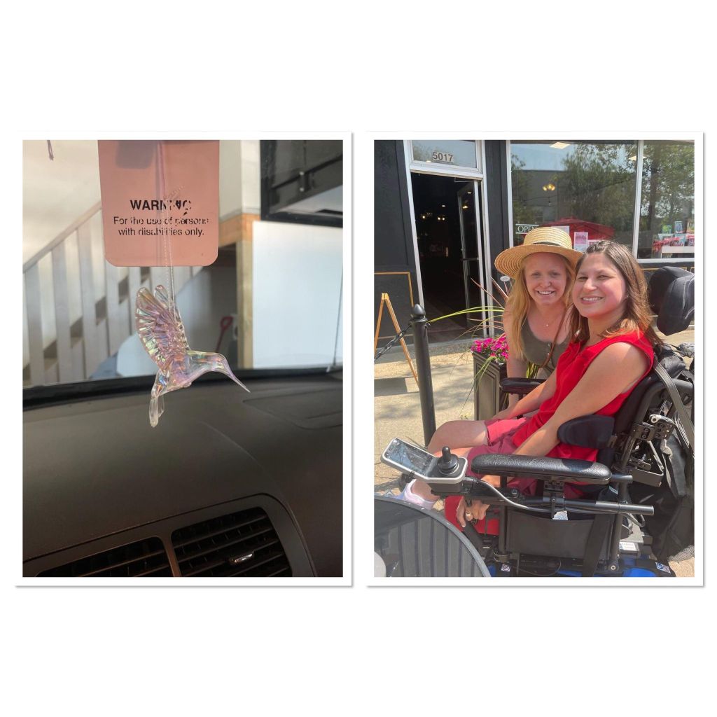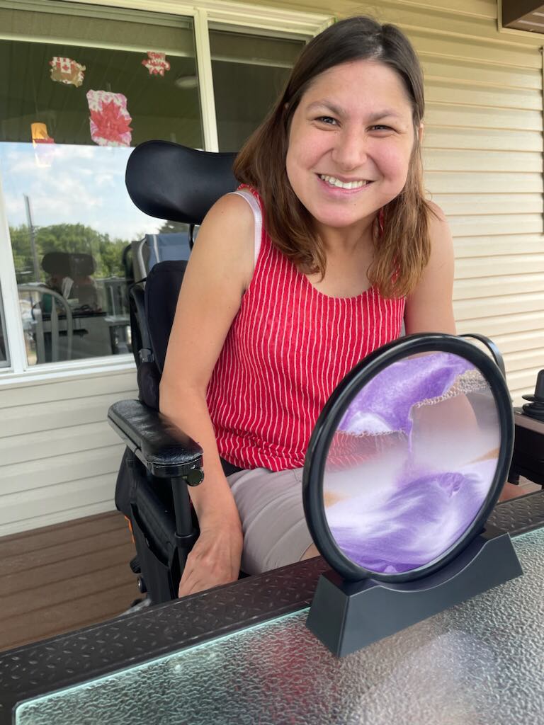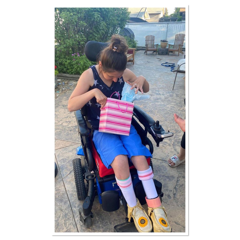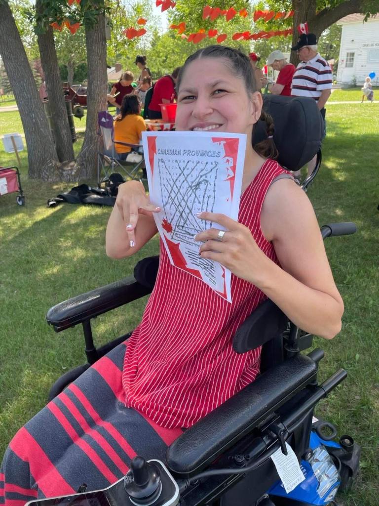 For Canada Day in the morning my dad and I went to the festivals at the museum and we tried to do the scavenger hunt of games , but they were all lower down to the ground and games I couldn’t play because I’m in a power wheelchair. I got to do the egg toss and it landed on my seat belt and broke. I got to play X and O’s and an word searches about Canada day. Then, in the afternoon my dad and I went to the car show downtown and looked at the fancy cars. Later on I coloured some Canada day themed pictures and put them on the window! We printed out some name tags that were maple leafs for our bedroom doors. In the middle of the night I could hear the fire works in my bedroom but I didn’t watch them. Happy Canada Day! My mom showed me my butterfly solar light , lit up in the darkness of the night! It’s so beautiful and pretty lighten up in the darkness sky!