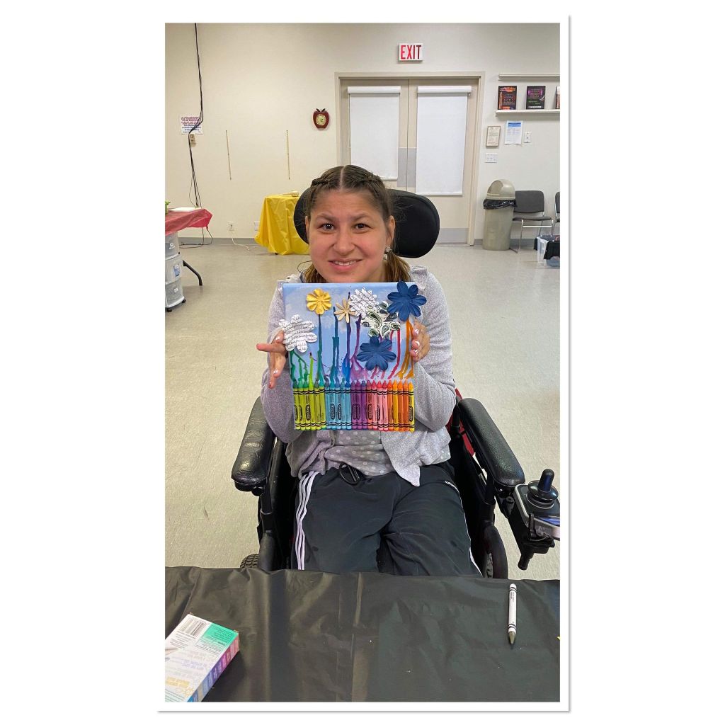 On Tuesday morning I finished the poster ” Hearing Impairment”. I will show you it in a future blog! In the afternoon on Tuesday, I got blood work done and I got my ID done, trying to get everything checked off the list. Then, mom and I sat outside enjoying her beautiful flowers. On Thursday afternoon we had a wonderful tour at the art Center by Co-op. I painted the background sky blue colour, then I painted some white clouds, and then we blow dried the crayons on the bottom half of the canvas for stems and hot glued paper flowers. It was an super super fun art craft class and it was pretty easy to do too. That’s June and a bit of July, I can’t wait to see what’s in the next couple of months, I hope you are having wonderful summer so far.