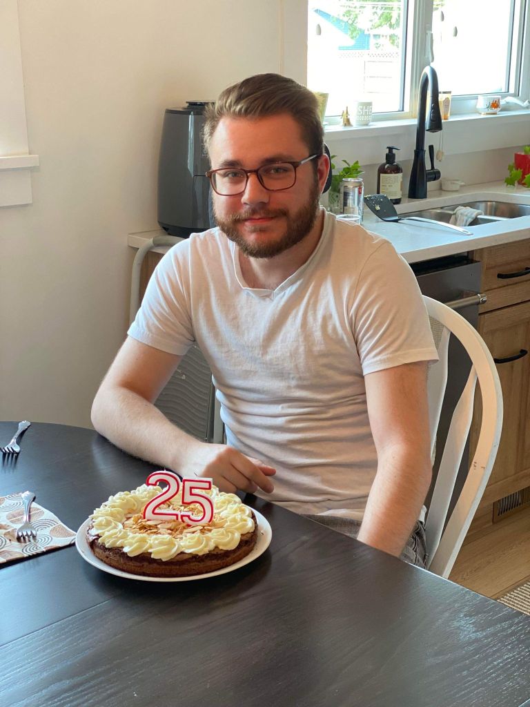 On Sunday evening we celebrated Luke’s 25 birthday! For his birthday presents he got a blender, bed sheets and some money. Luke’s friend Josiah and his mom Anna-Maire brought him a mug and a game. His birthday cake was brownie with almonds and cream cheese Icing. His birthday was on Tuesday.