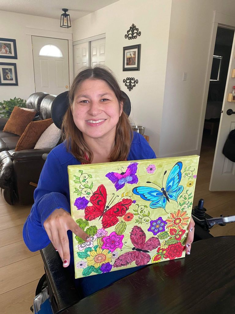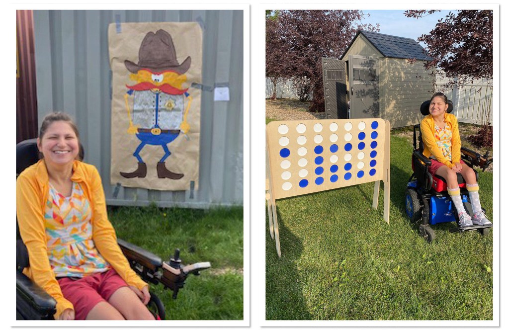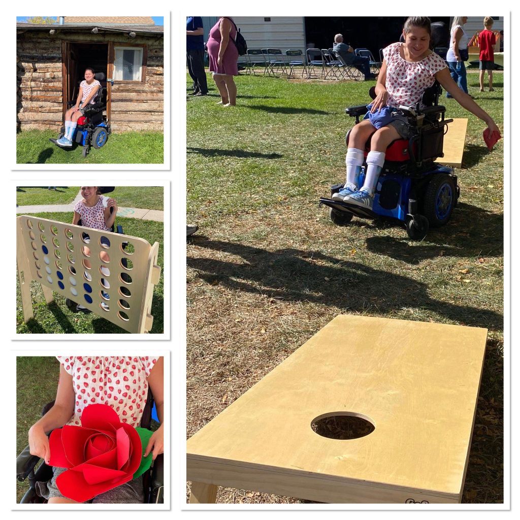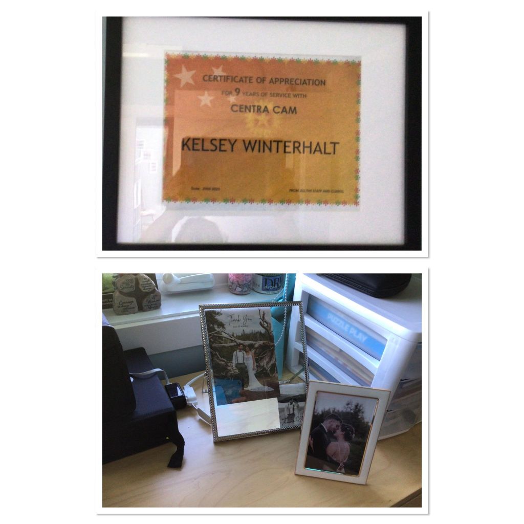 Their was an table set up in an tent with Centra Cam’s art and crafts that was made by the clients and some pictures of the clients. I held one of the roses that we made from the garden party and the BBQ. There was outdoor games like bean bag toss and connect four. We played together. Later on my dad put up my picture frame on the wall, that has the certificate for nine years of service at Centra Cam inside of the picture fame .