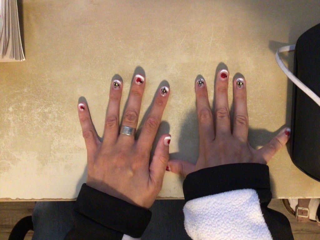 On Tuesday afternoon my friend Amanda and I went for nails. I got bees and ladybugs with an French manicure.