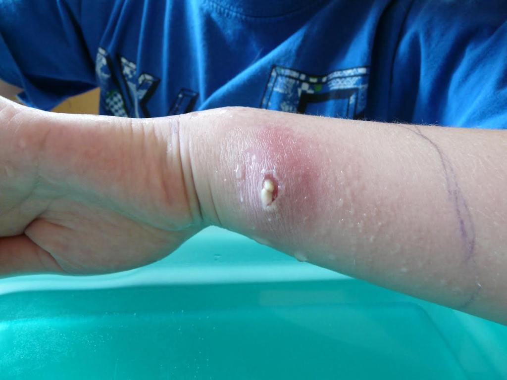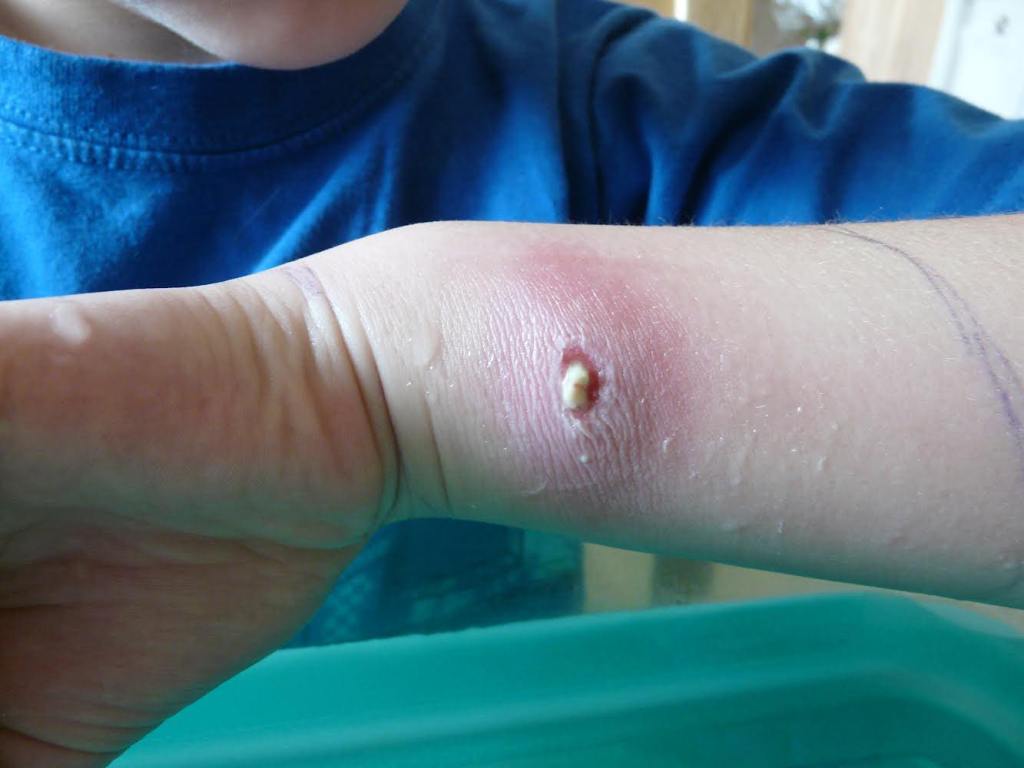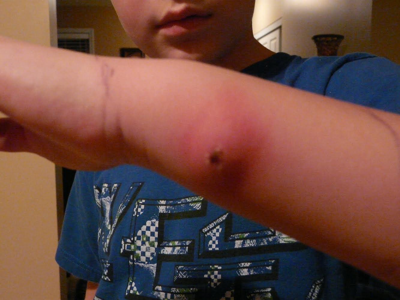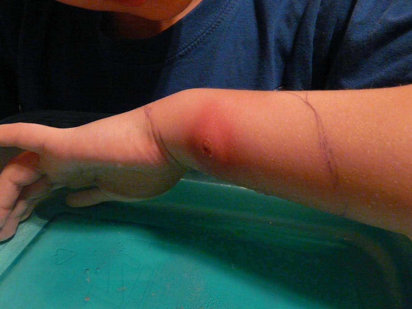 Sheila: We were told to soak his wrist in warm water to draw out the toxins. A plug of puss eventually came out about the size of a pencil eraser. Luke was left with a hole in his wrist, that eventually closed in.