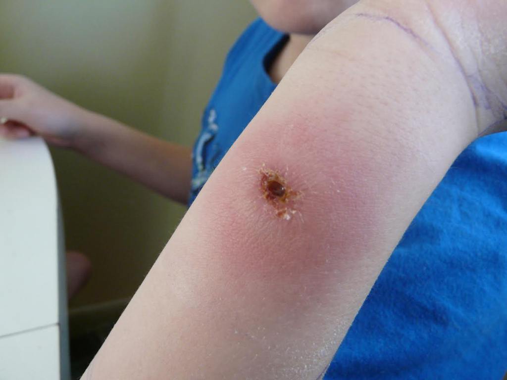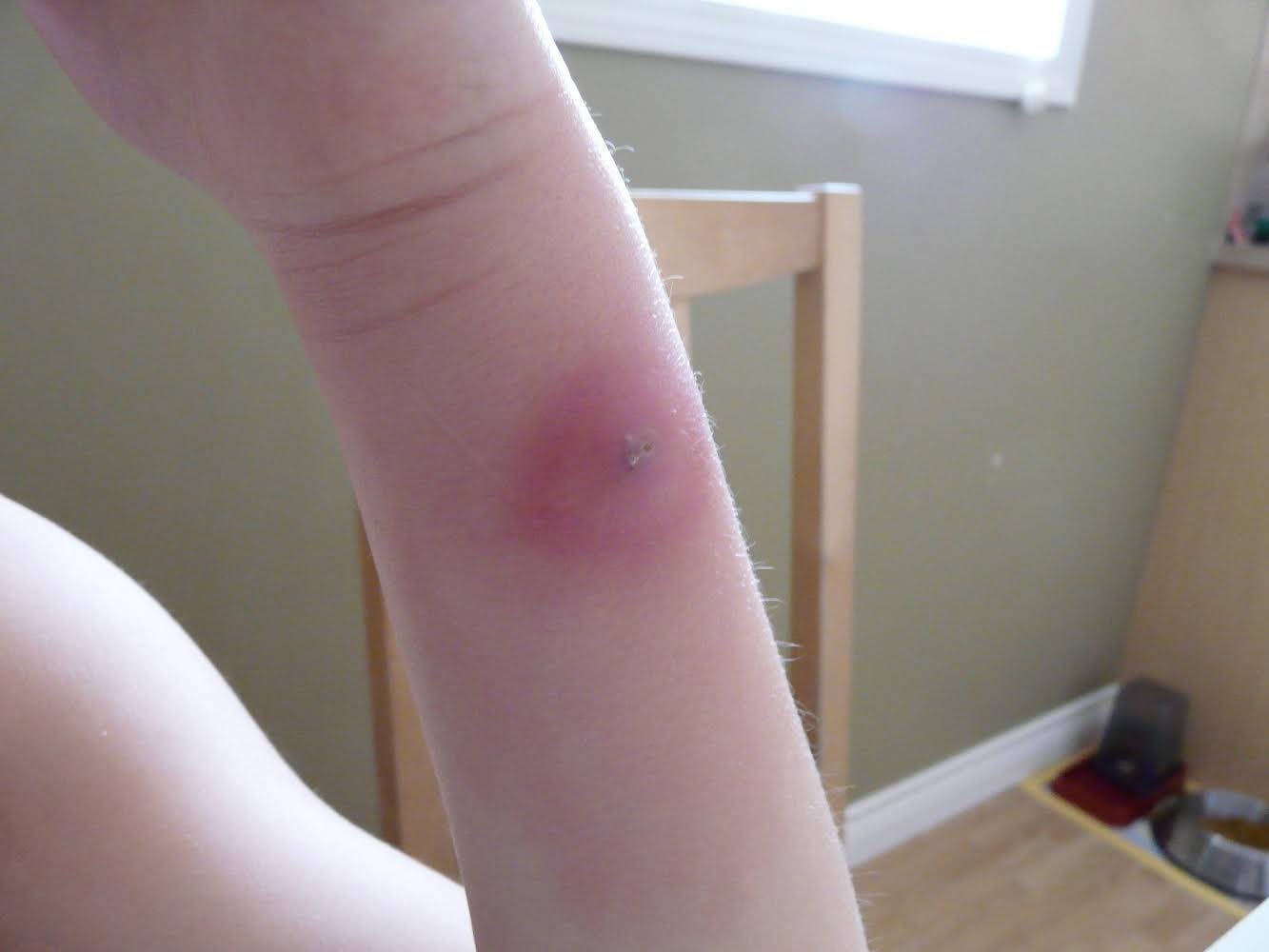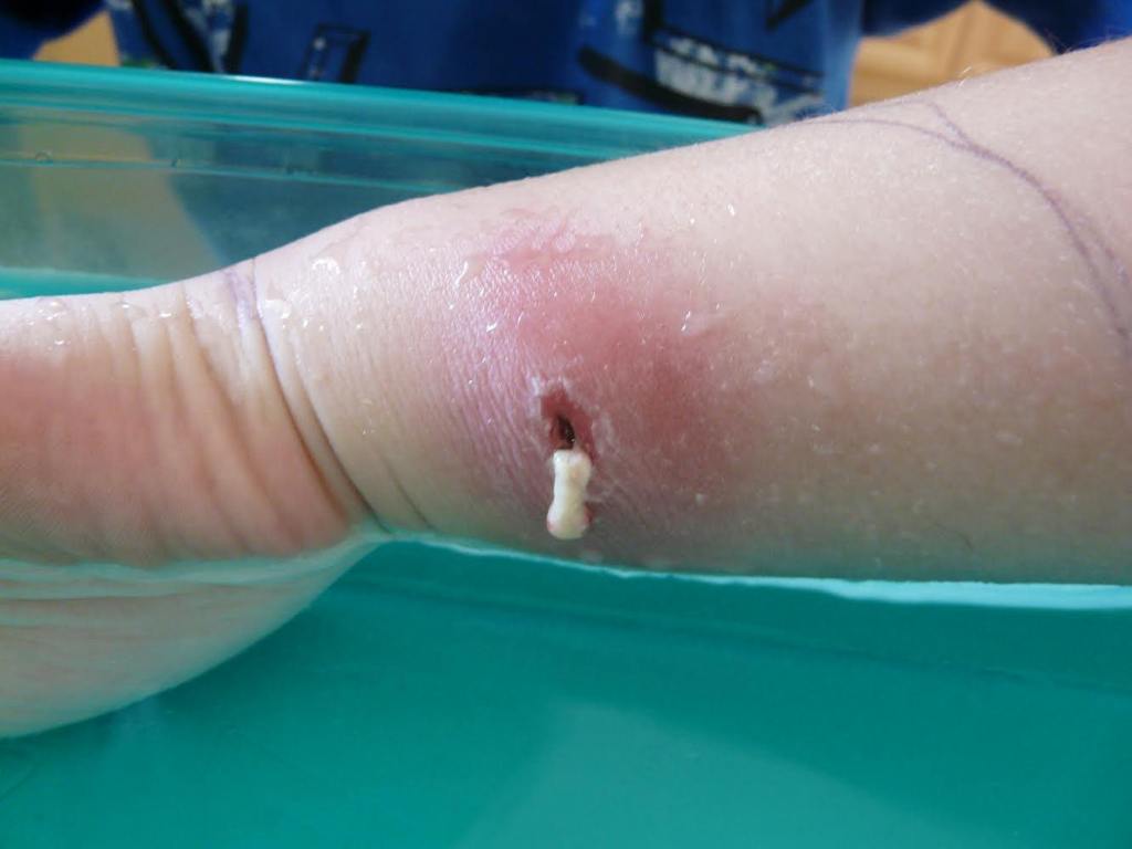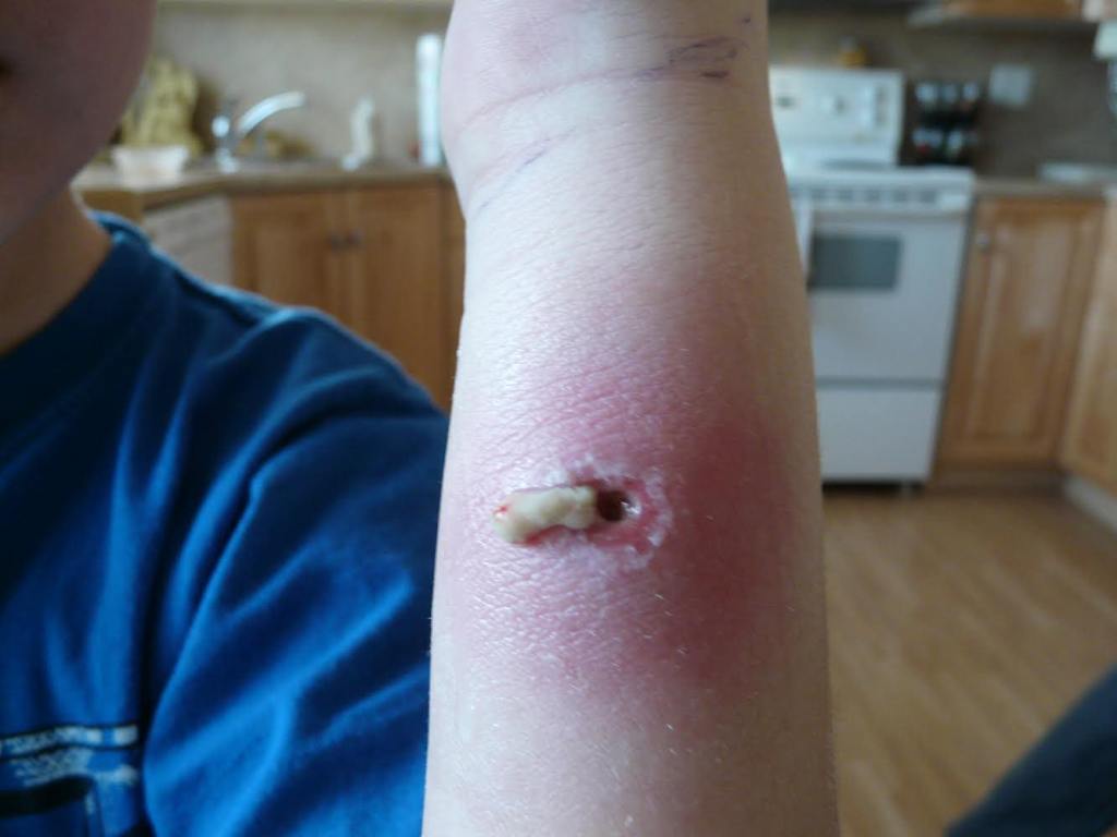 Sheila: We were told to soak his wrist in warm water to draw out the toxins. A plug of puss eventually came out about the size of a pencil eraser. Luke was left with a hole in his wrist, that eventually closed in.