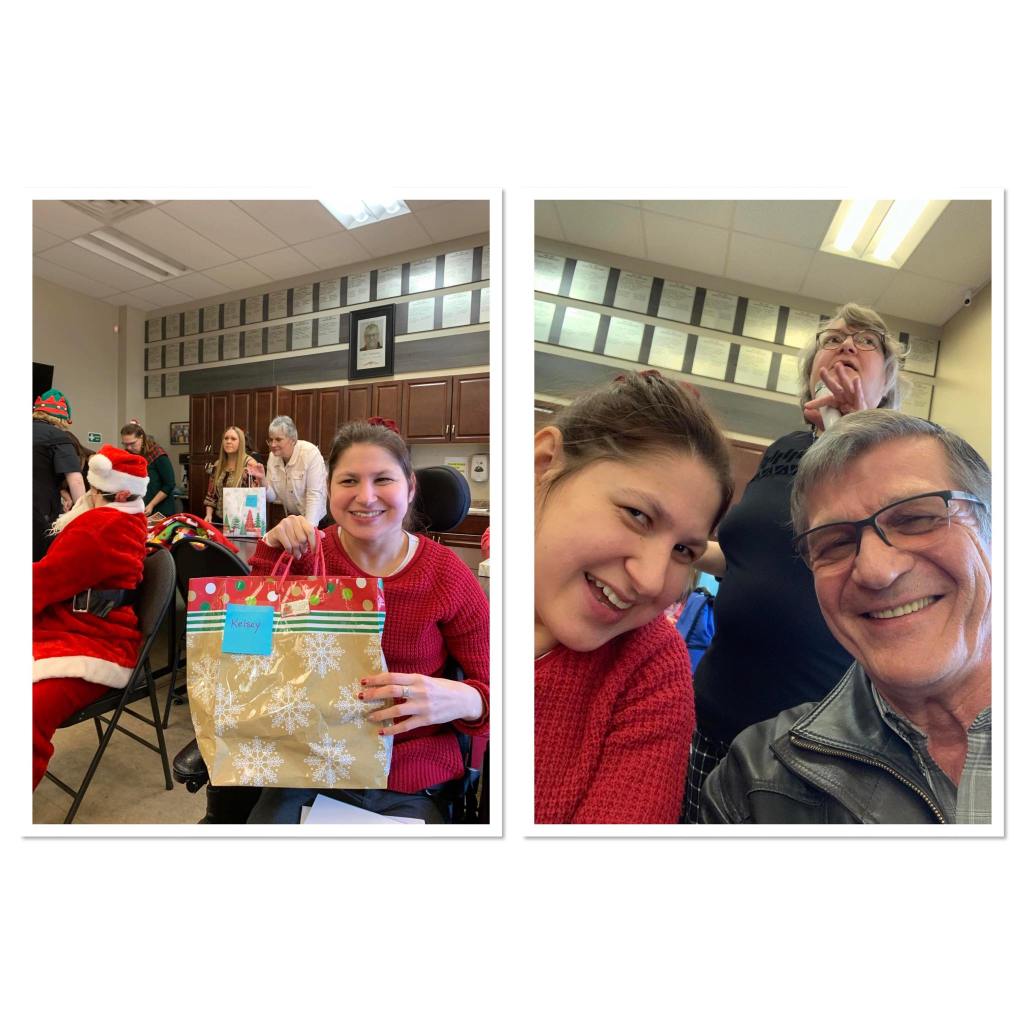On Thursday we had our last day of Centra Cam and our Christmas party. In the morning we had Christmas songs bingo and then everyone had turkey dinner and I got berry cheesecake. In the afternoon was gift exchange and Christmas songs for everyone. My Christmas present was fuzzy socks. Then a Christmas dance to end our Christmas party. You got to bring a guest so I brought my Grandpa Ray.