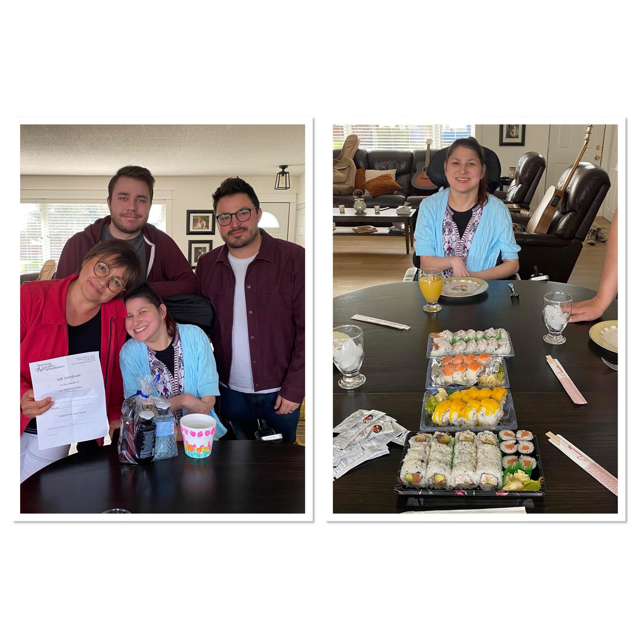 flowers in her backyard and she got to water them too! We ordered sushi for