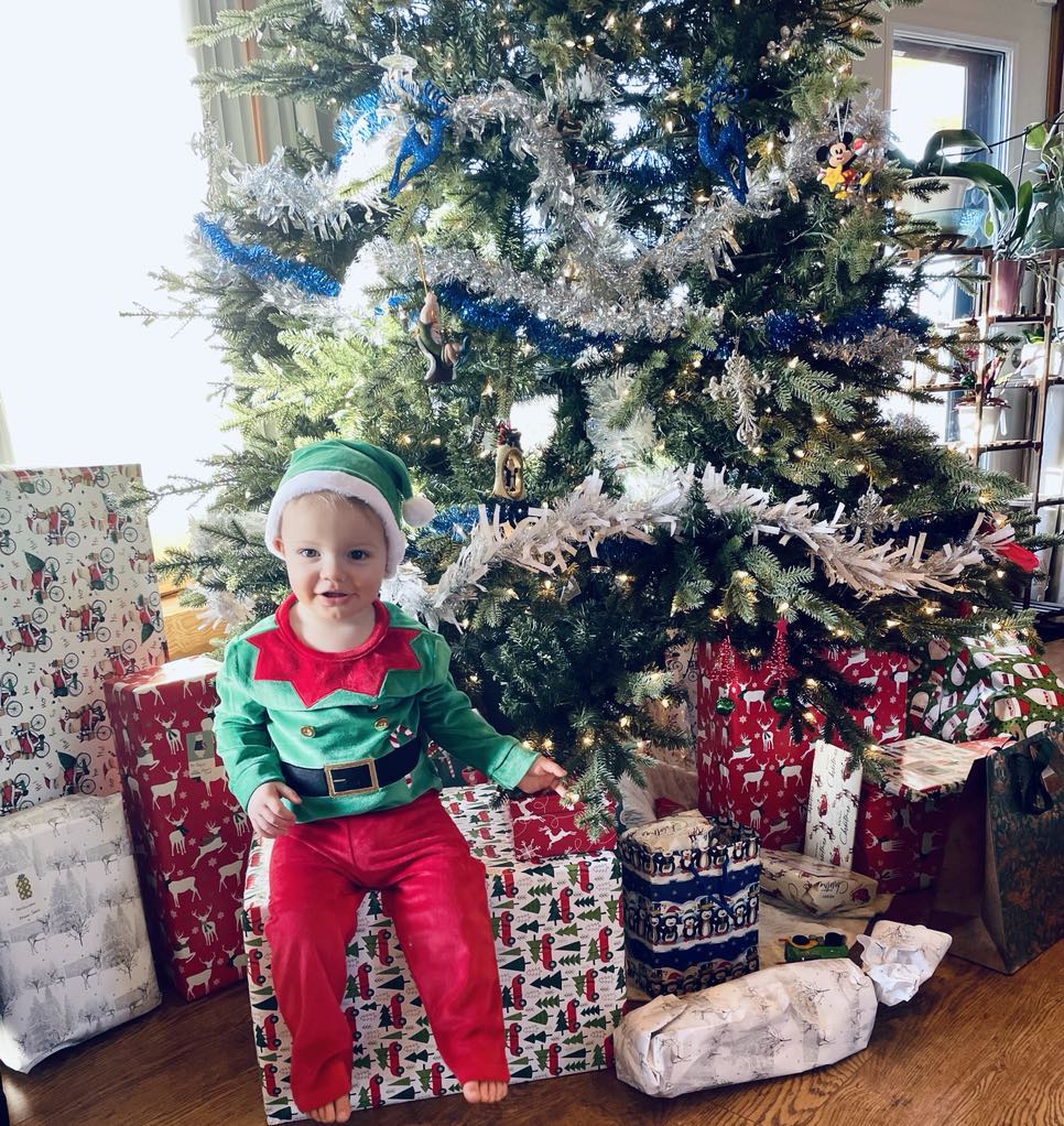 Johdi  –  Hmm. We don’t really have a lot but now with Hayes we will be doing a Christmas Eve box that will have Christmas pjs, Christmas movie, a book and a snack, that he can open on Christmas Eve. We will also be putting out milk and cookies for Santa.I think another tradition we will start is taking a picture in front of the tree.